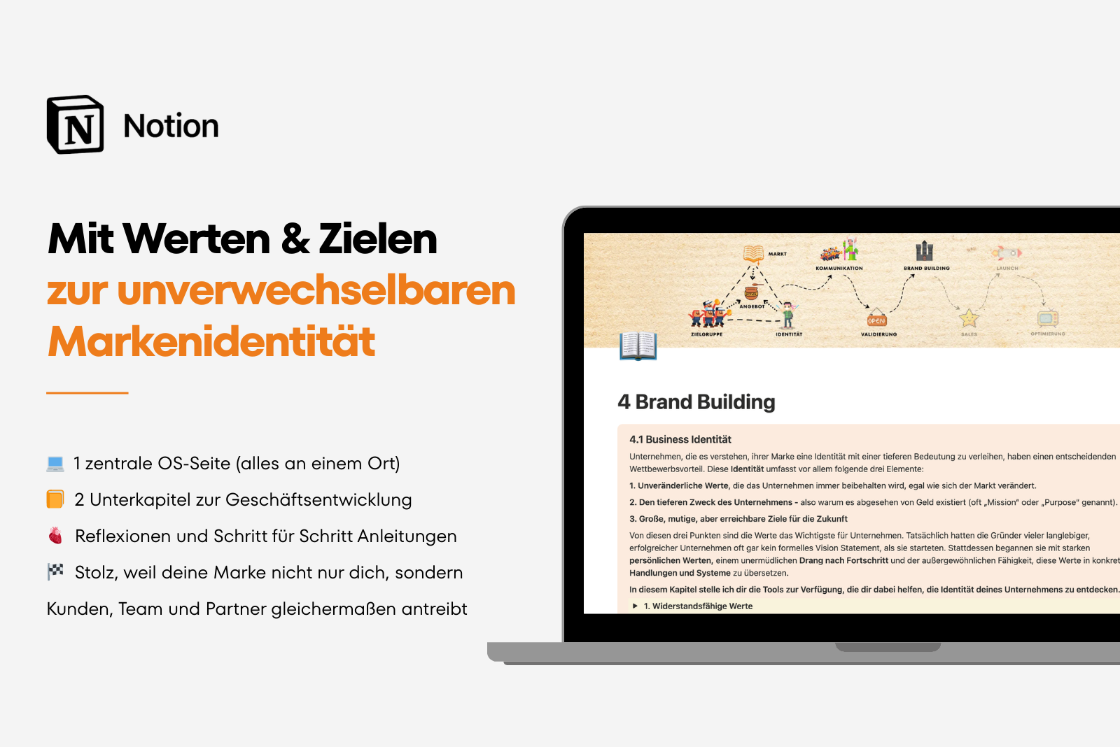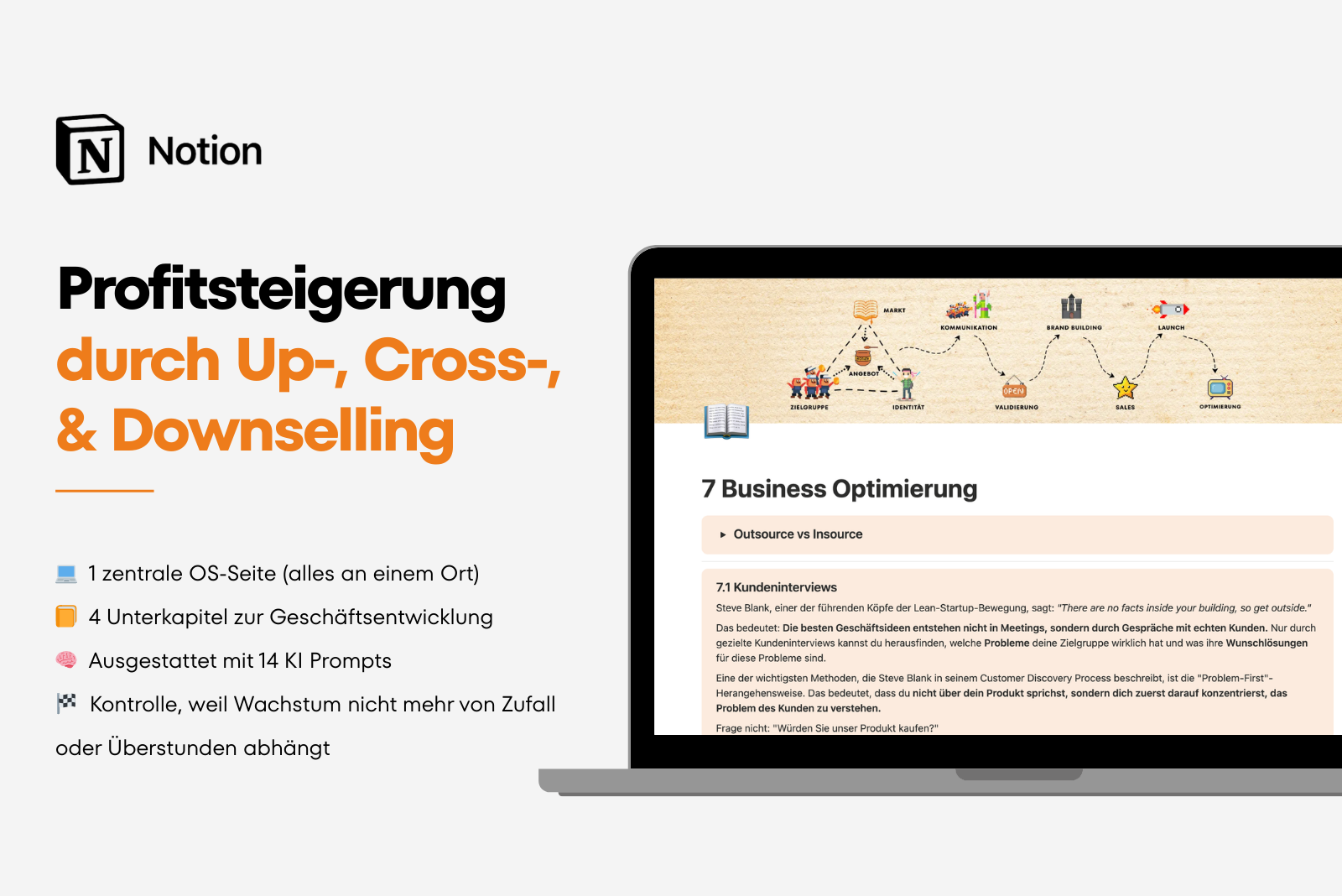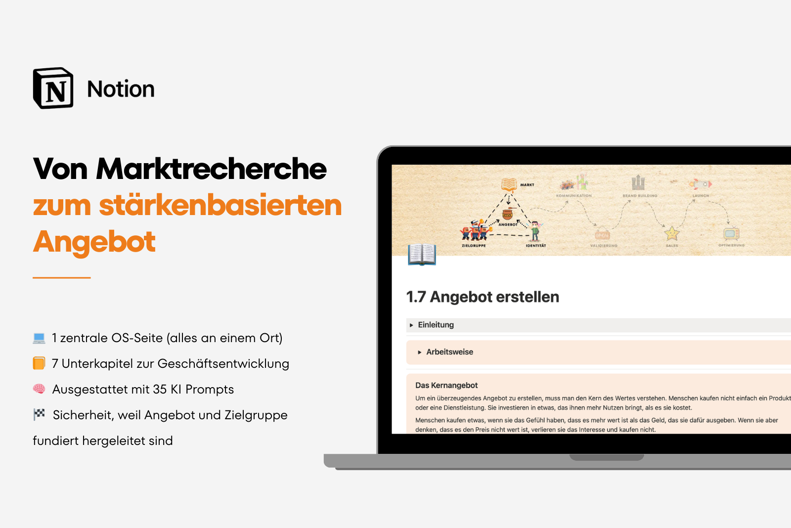 Mit diesem System entsteht ein klarer Prozess von Marktrecherche und Stärkenanalyse über Zielgruppe, Positionierung und Kundengewinnung bis hin zu Brand Building, Sales, Launch und Business Optimierung.