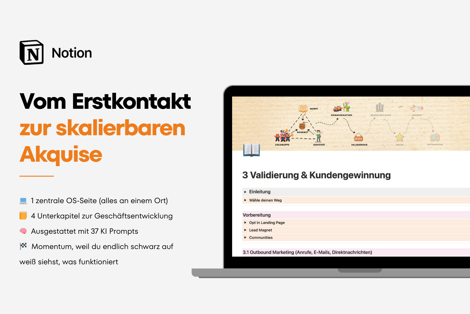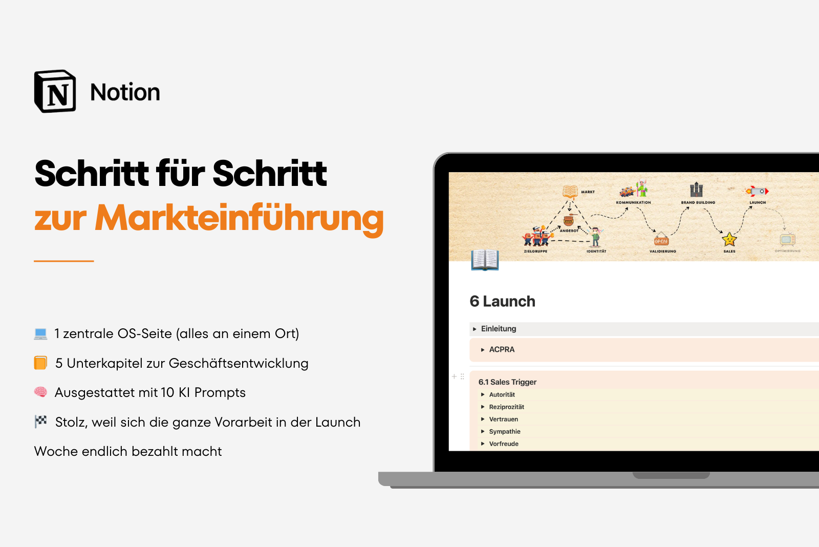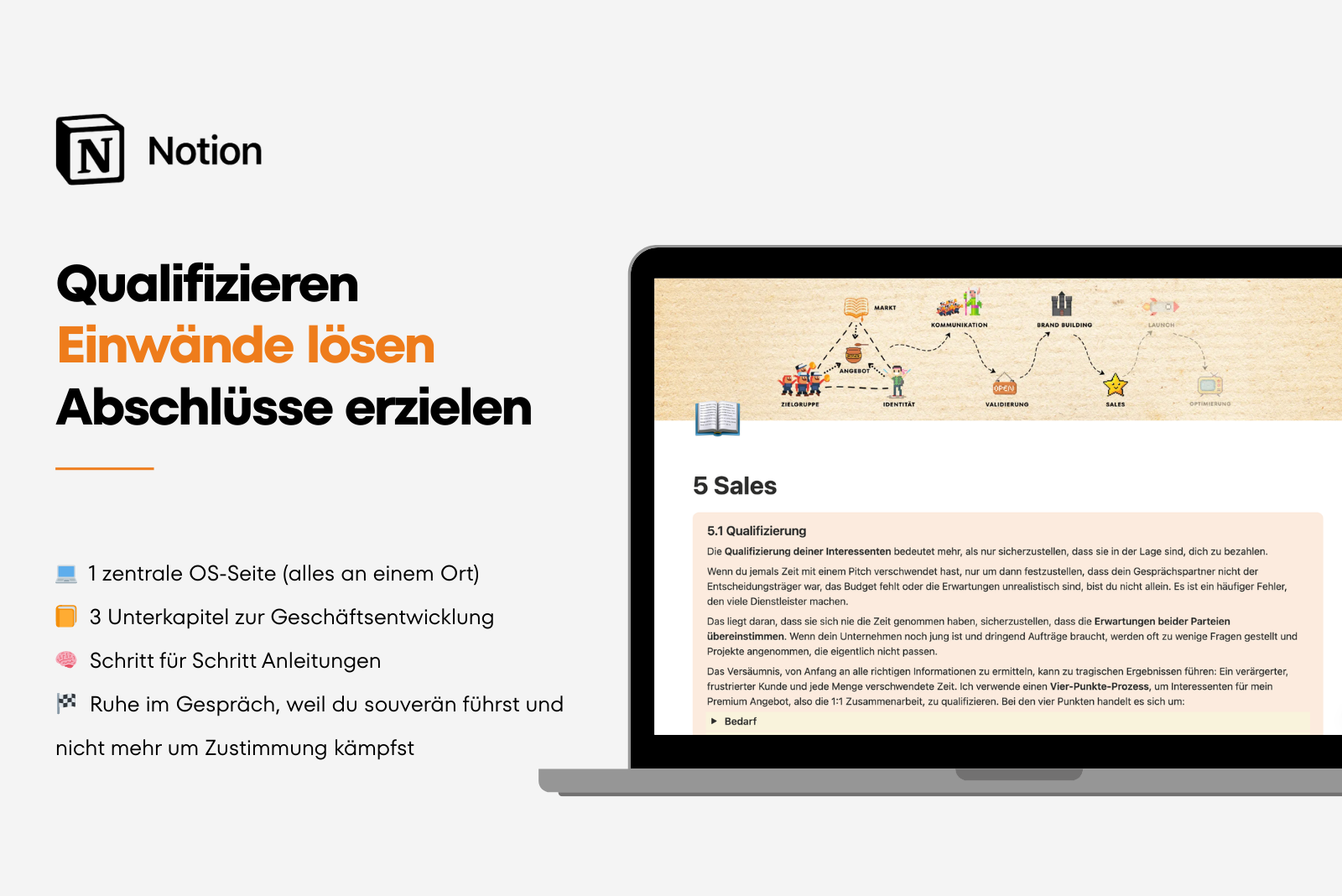 Mit diesem System entsteht ein klarer Prozess von Marktrecherche und Stärkenanalyse über Zielgruppe, Positionierung und Kundengewinnung bis hin zu Brand Building, Sales, Launch und Business Optimierung.