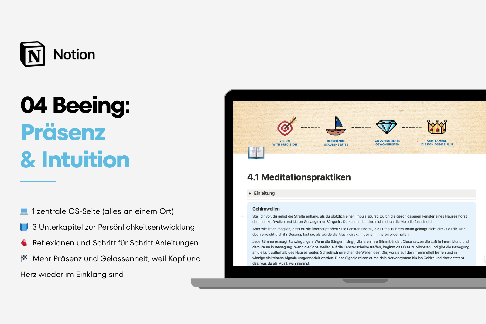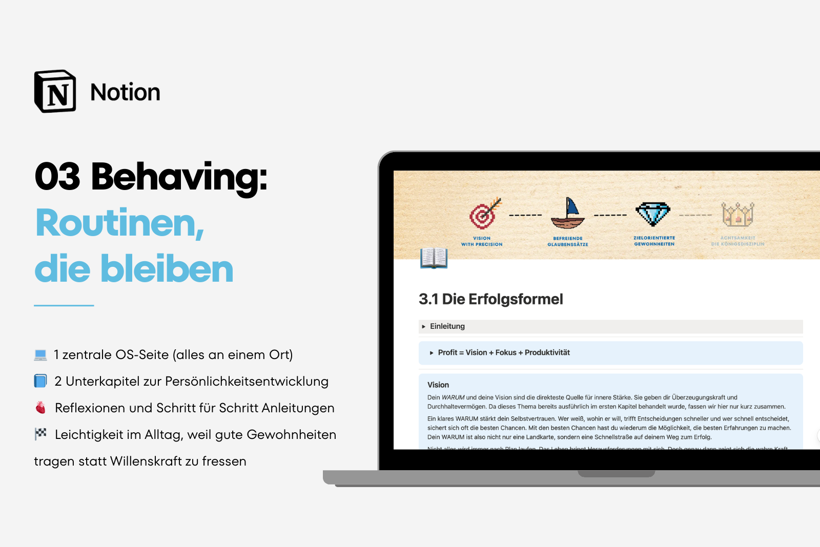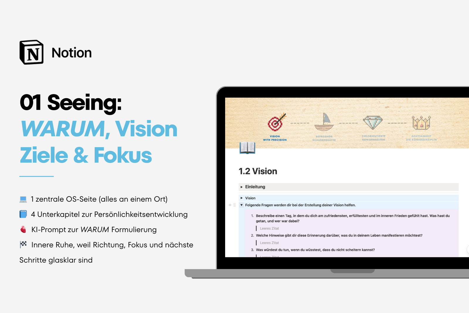 Mit diesem System entsteht ein klarer Prozess von WARUM und Vision über neue Denkmuster und kraftvolle Routinen bis hin zu mehr Präsenz im Alltag.